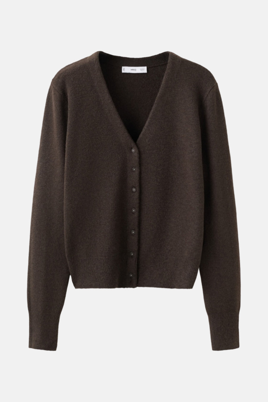 Gilet marron in MANGO tricots, op een papier craftachtergrond.