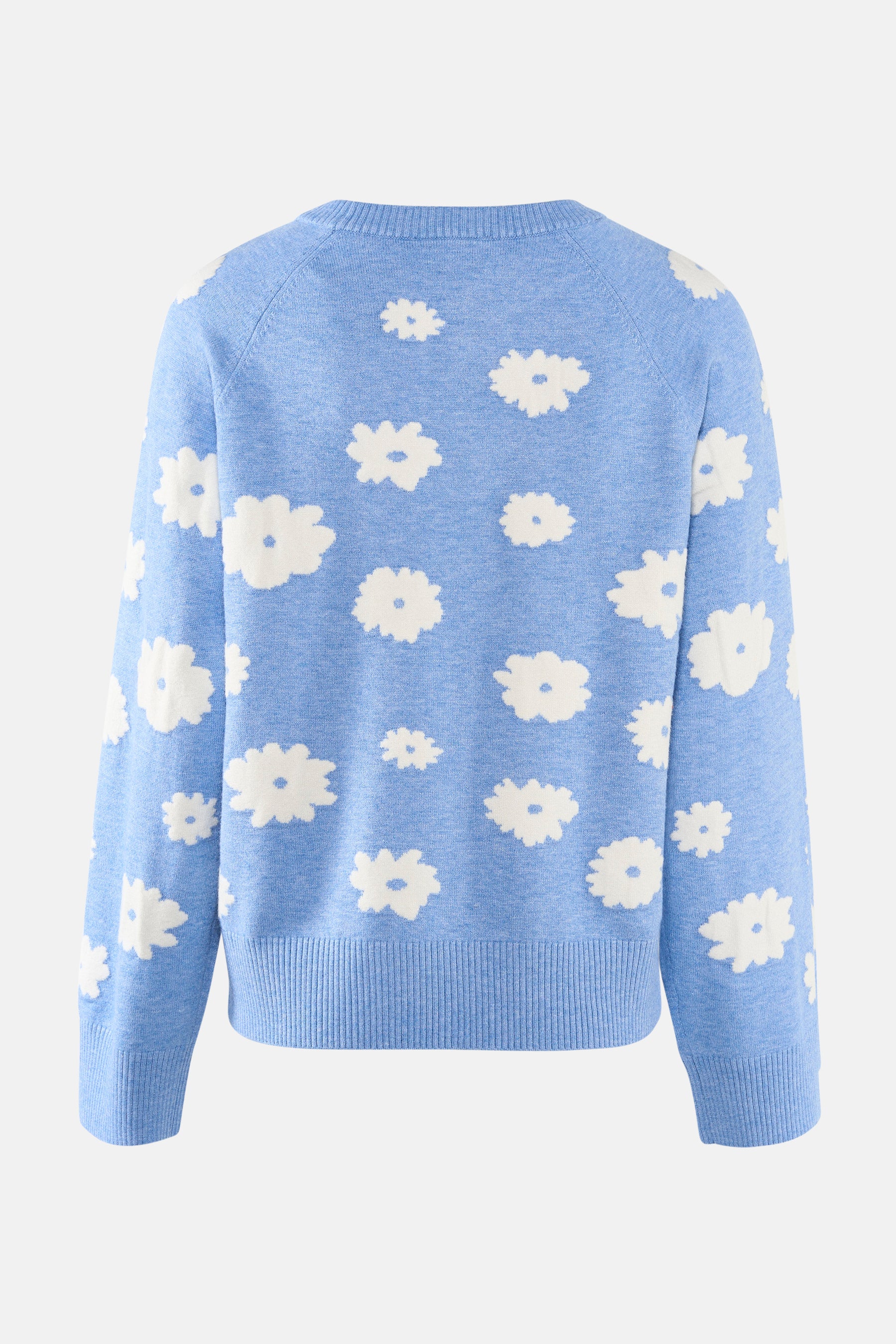 Pull à col rond bleu de FREEQUENT, à motif floral blanc sur l'ensemble.