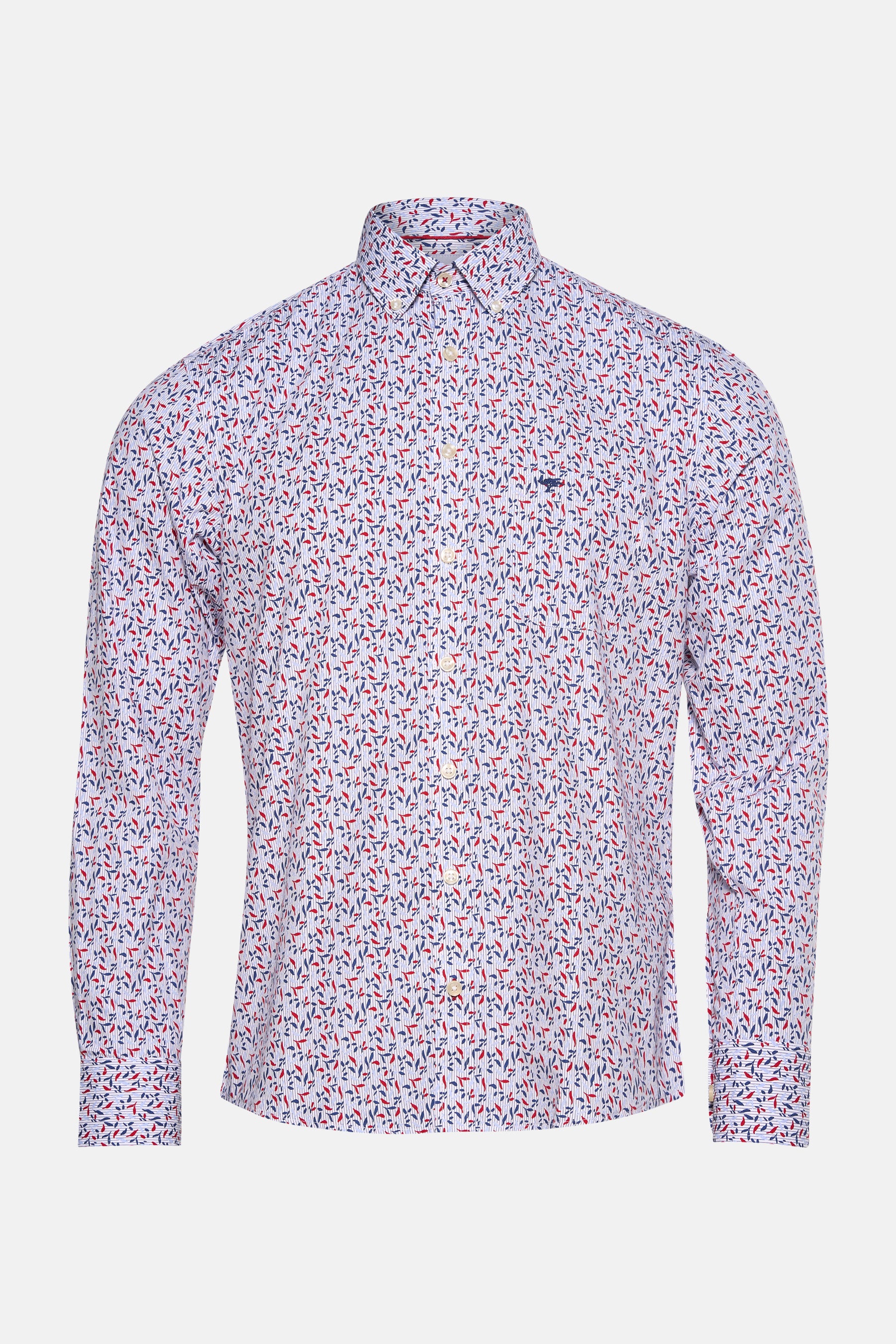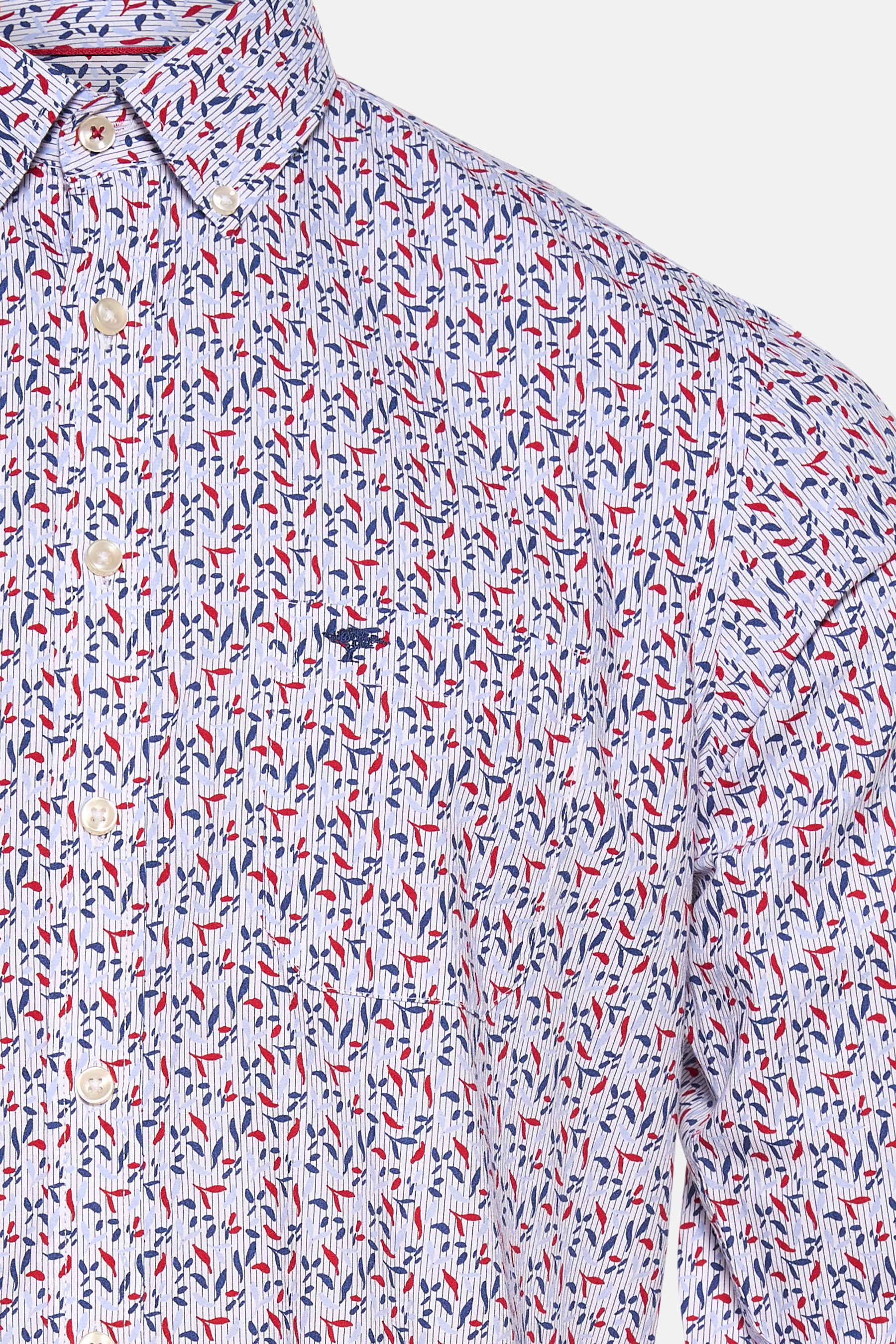 Chemise à manches longues rouge de FYNCH-HATTON, à motifs feuilles bleus et rouges.