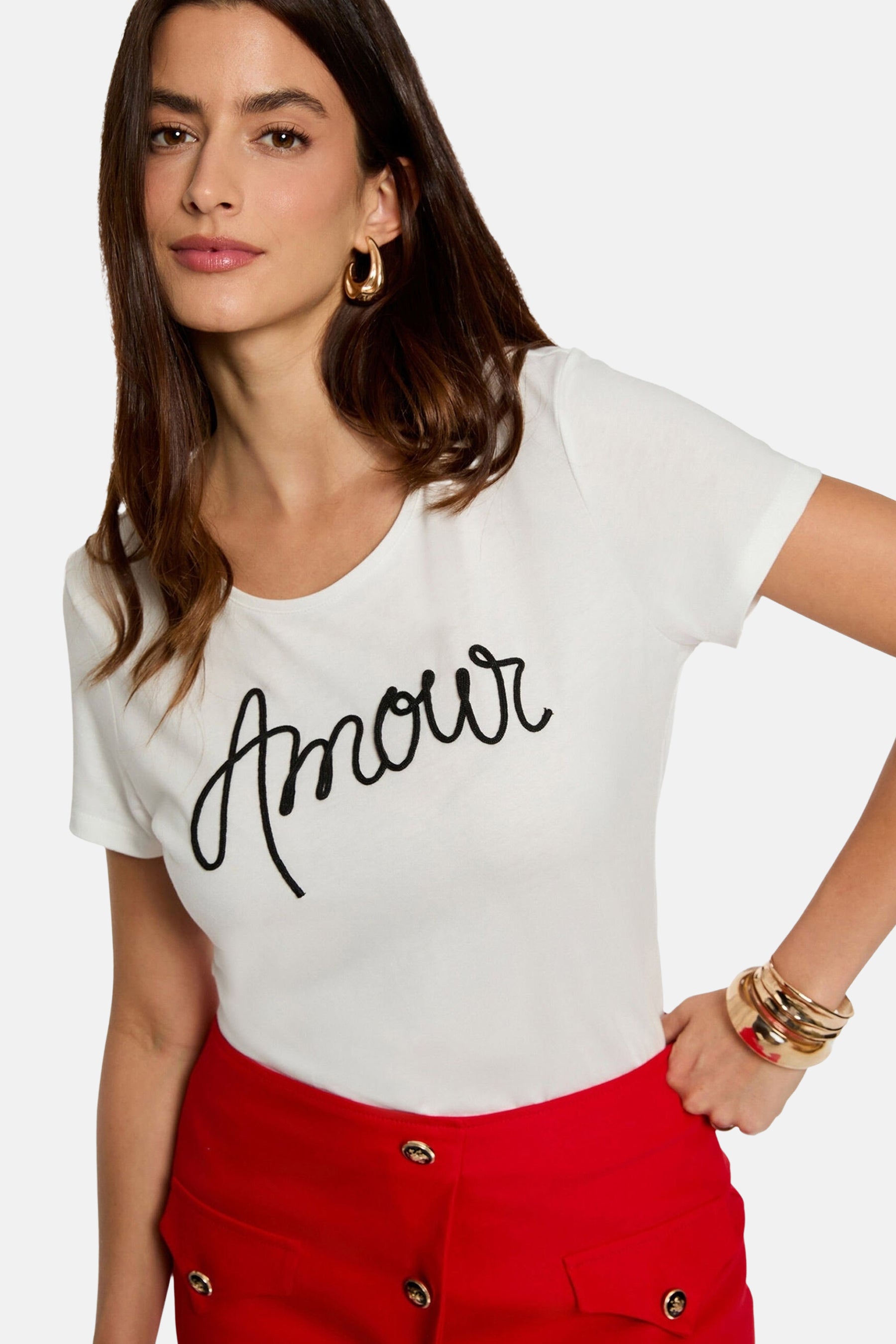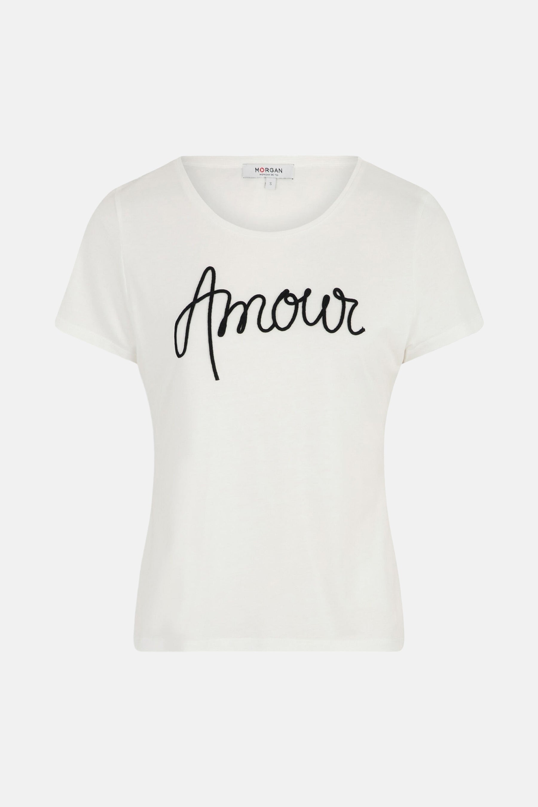 Top blanc à manches courtes de Morgan de Toi, avec l'inscription "Amour" en noir.