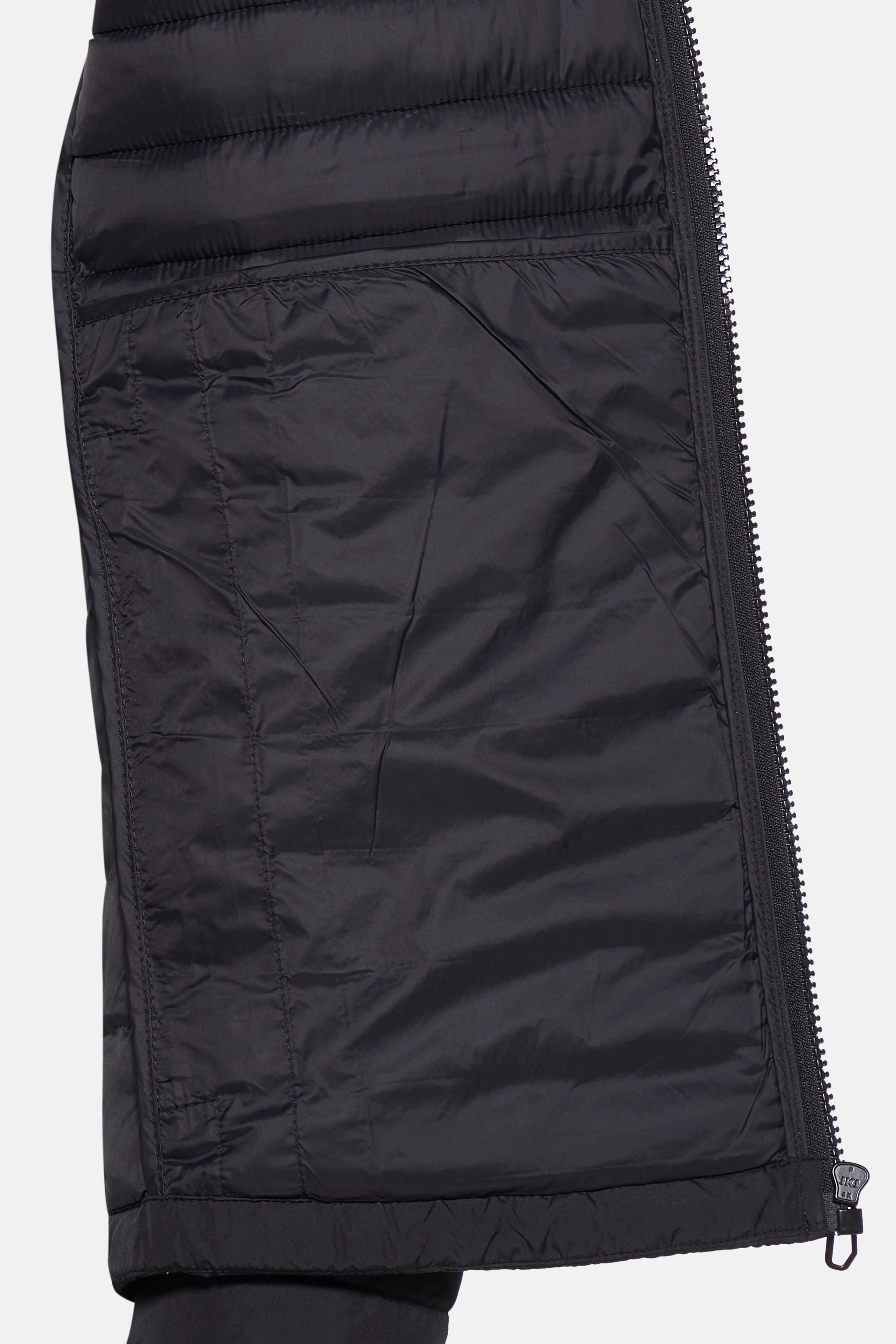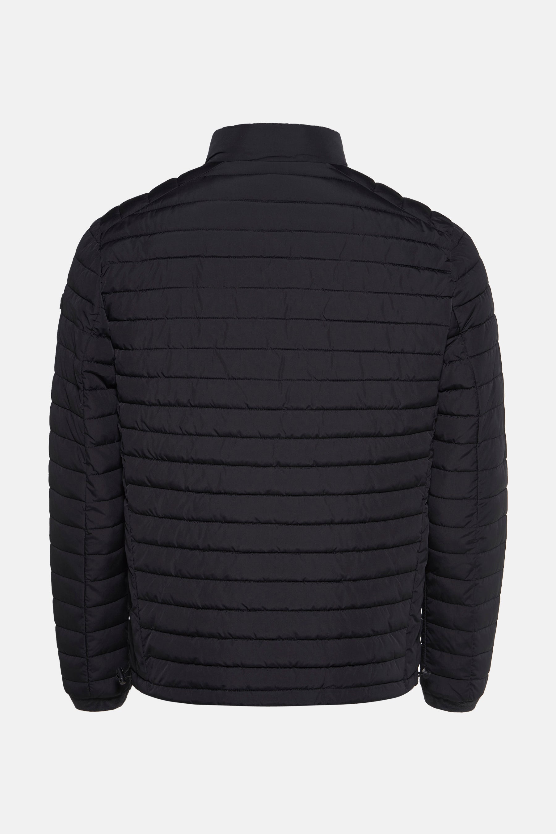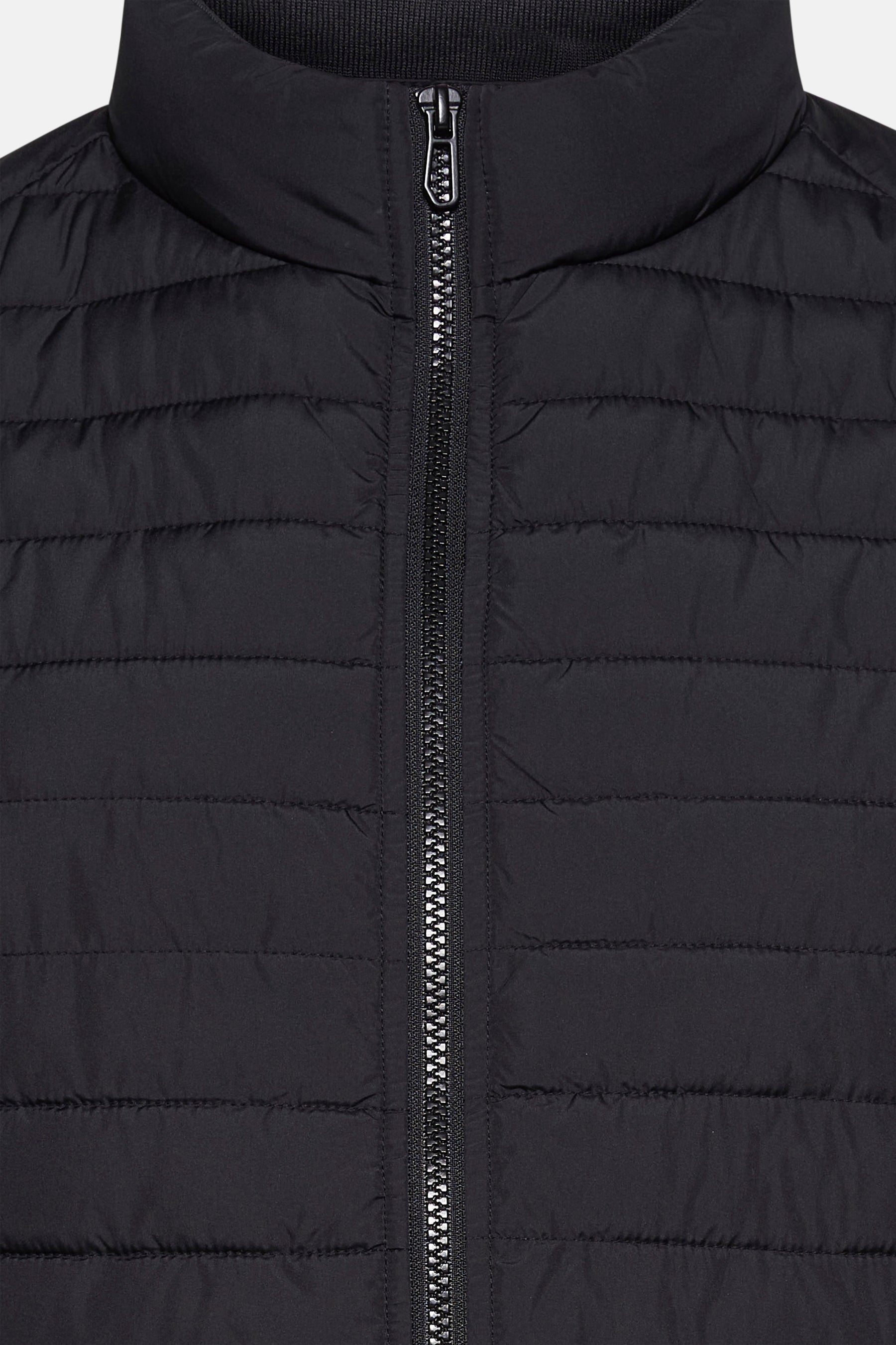 Veste courte noire de PRIVATE BLUE, matelassée avec une fermeture éclair centrée et des poches latérales zippées.