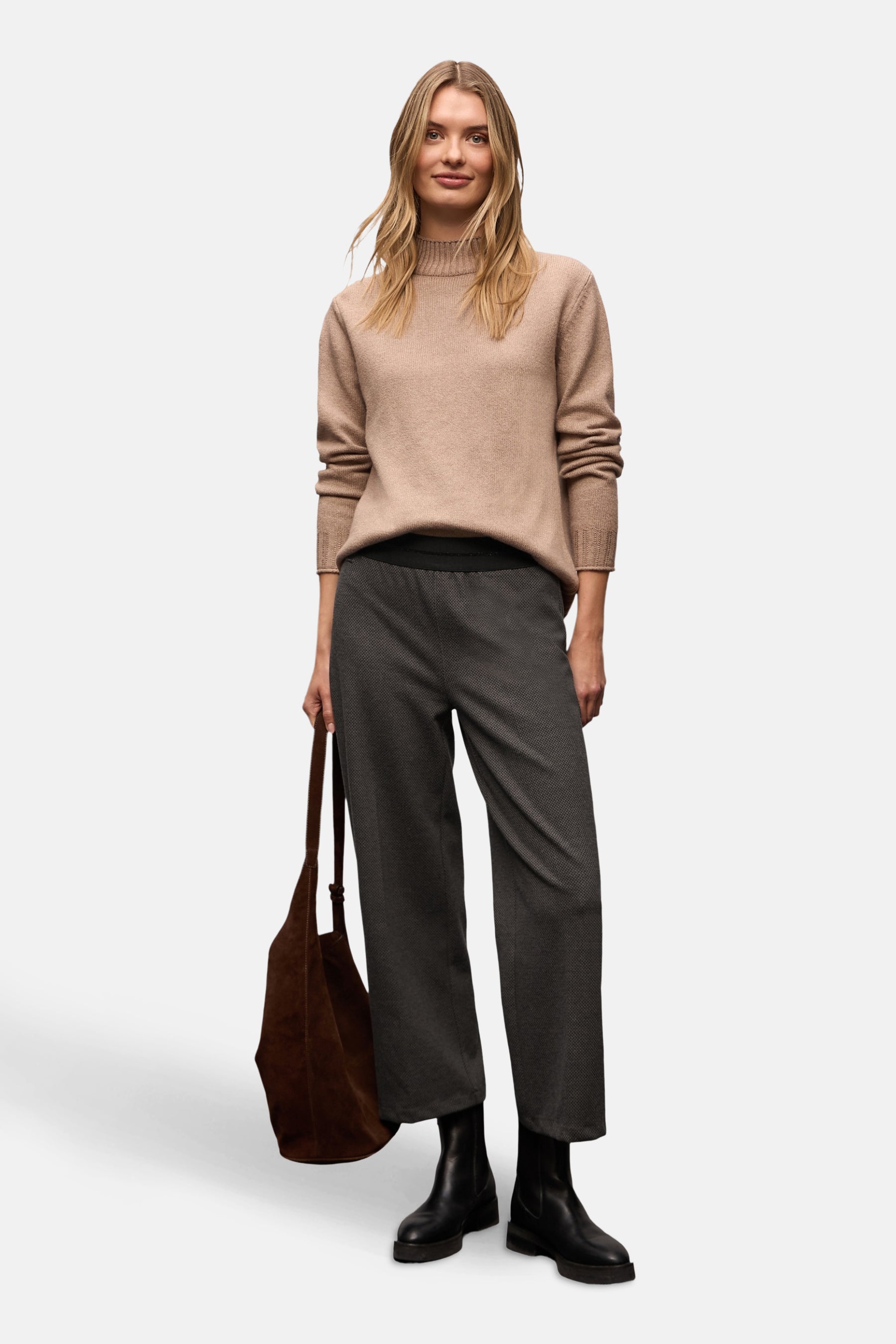 Pantalon brun de STREET ONE, coupe ample, avec un motif à chevrons discret et des bottes noires.
