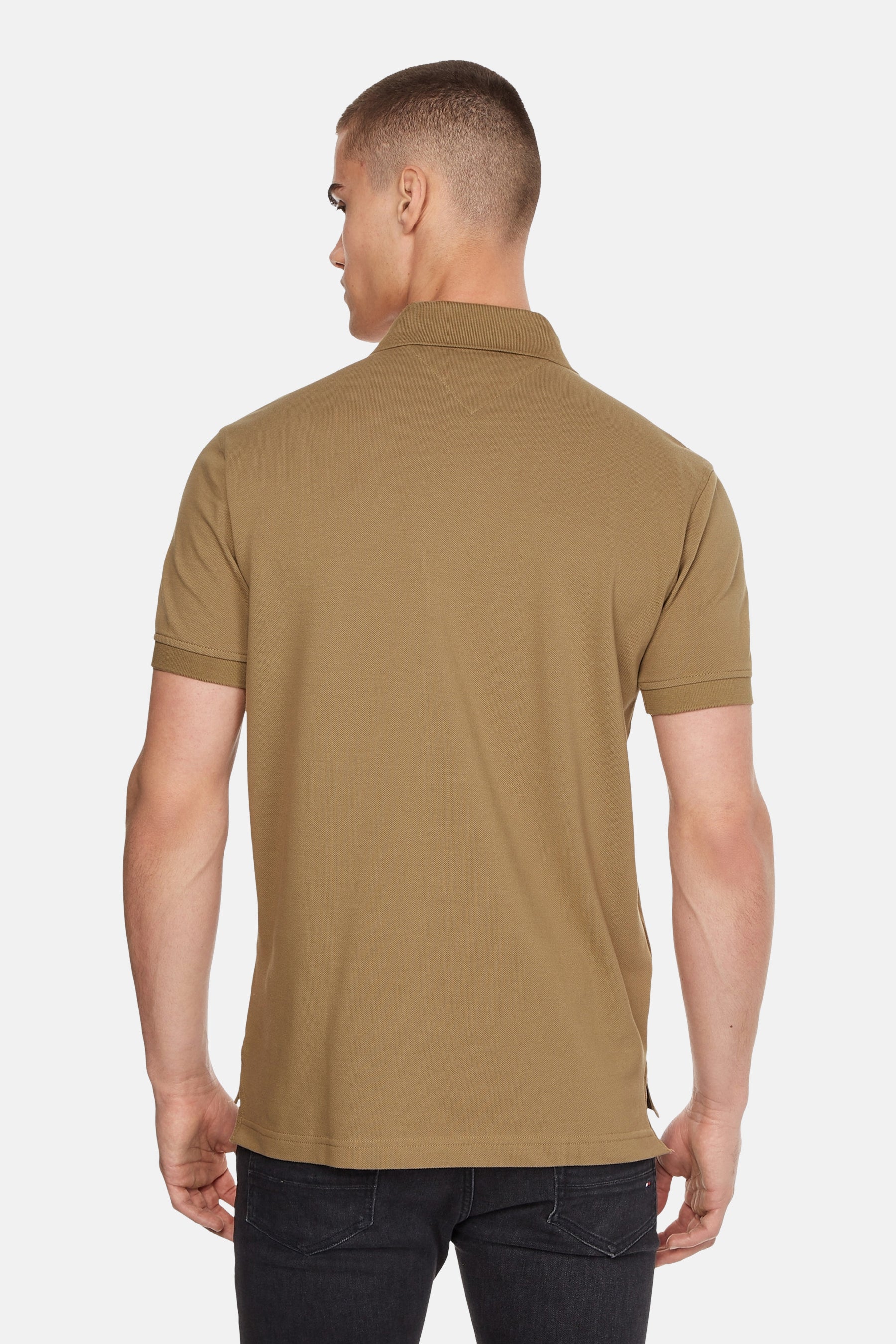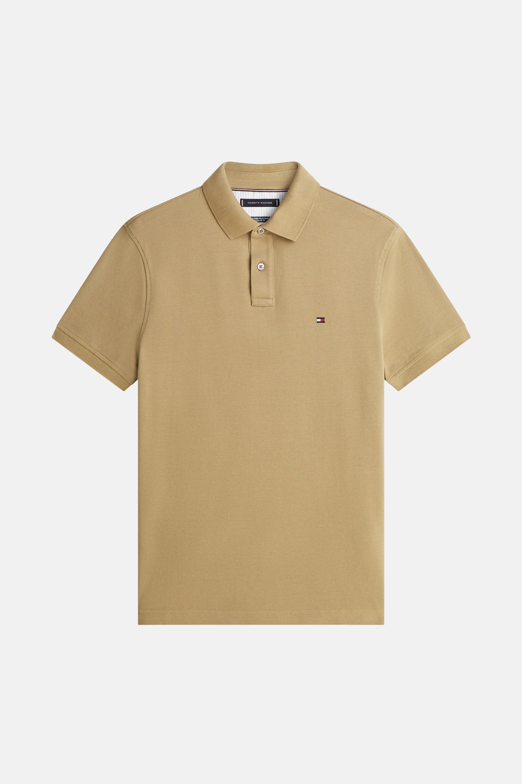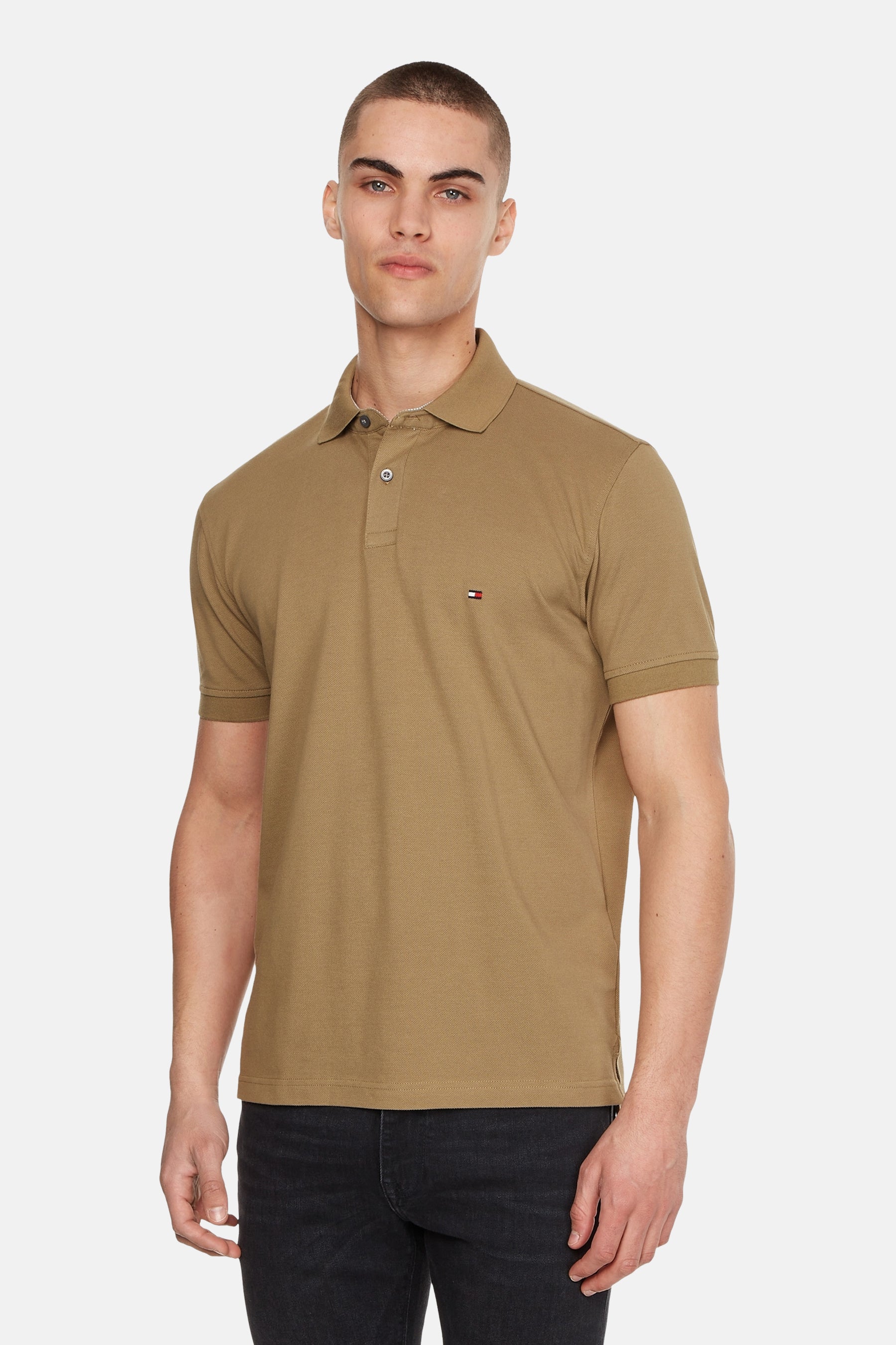 Polo kaki à manches courtes de TOMMY HILFIGER, porté avec un pantalon blanc uni.